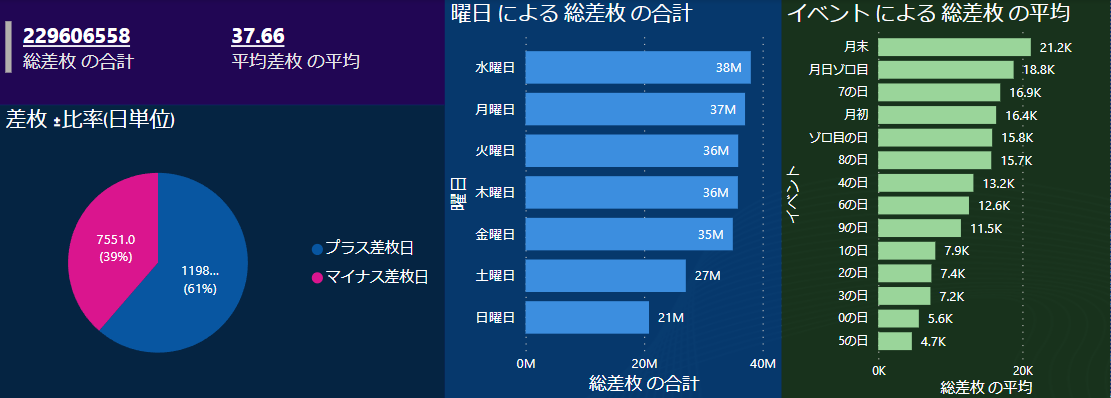 また、土日のイベントは平日に比べて数値は悪く、特に日曜はイベントも少なく総差枚も低い数値となっている。
