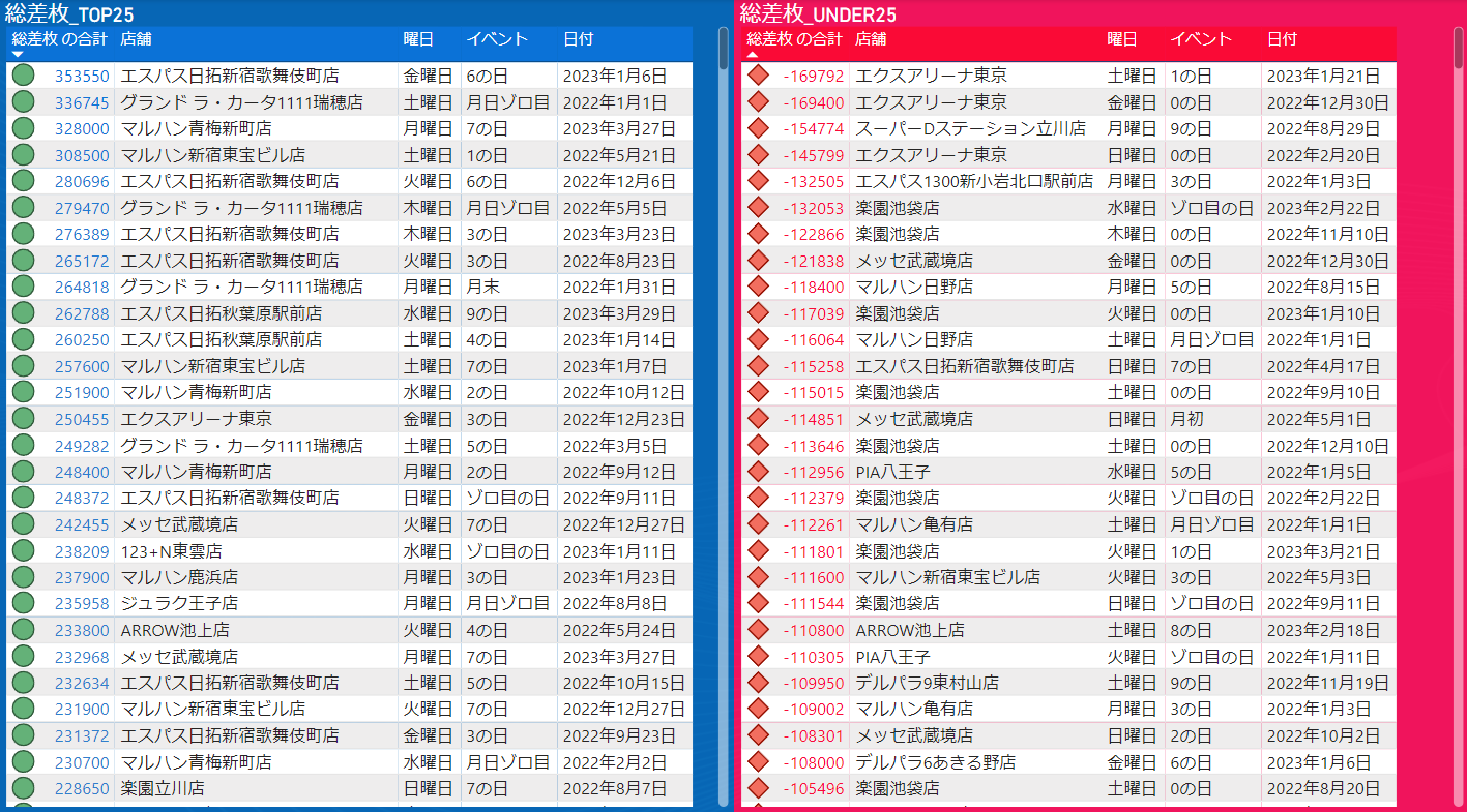 最後に「総差枚 Top25-Under25 Daily」では単独のイベント別差枚結果をランキング形式で掲載している。