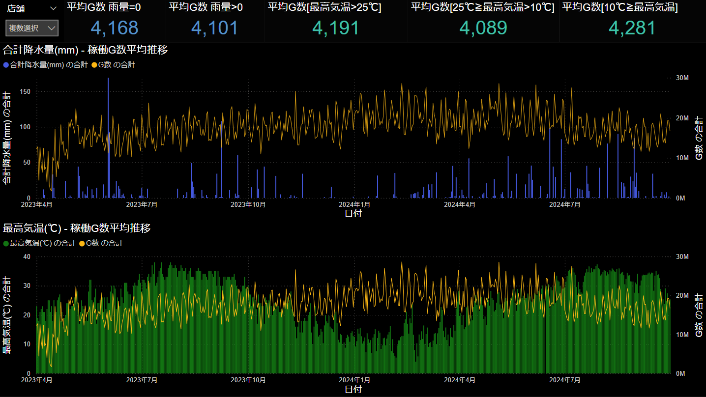 1年間の東京都の降水量、気温などの気象データとスロットの稼働G数について関連性を分析した結果が下記である。