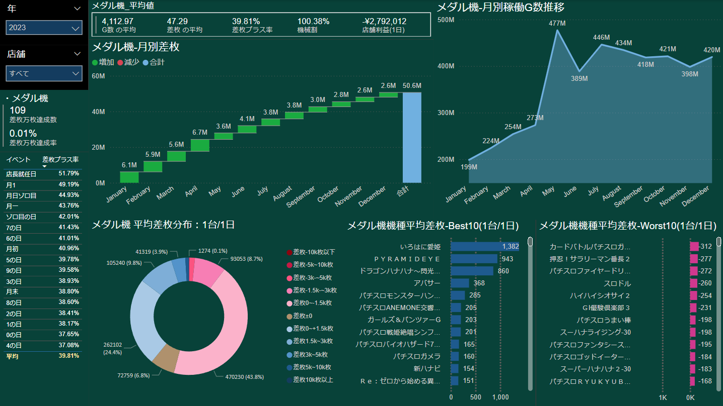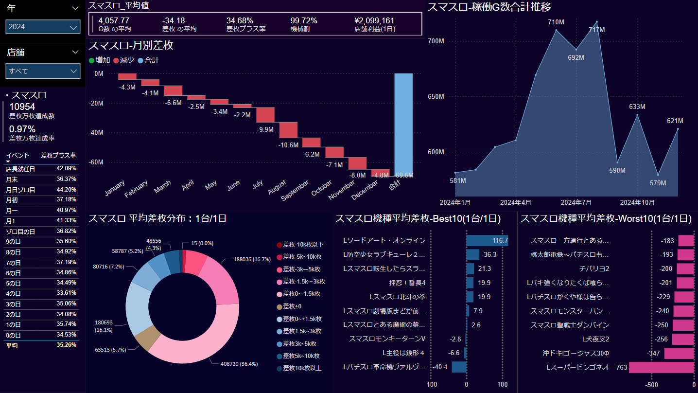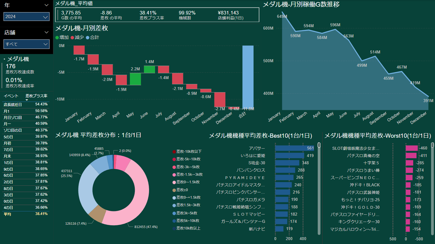2024年はメダル機の稼働は右肩下がりで且つ差枚もマイナスに転じていることが分かる。